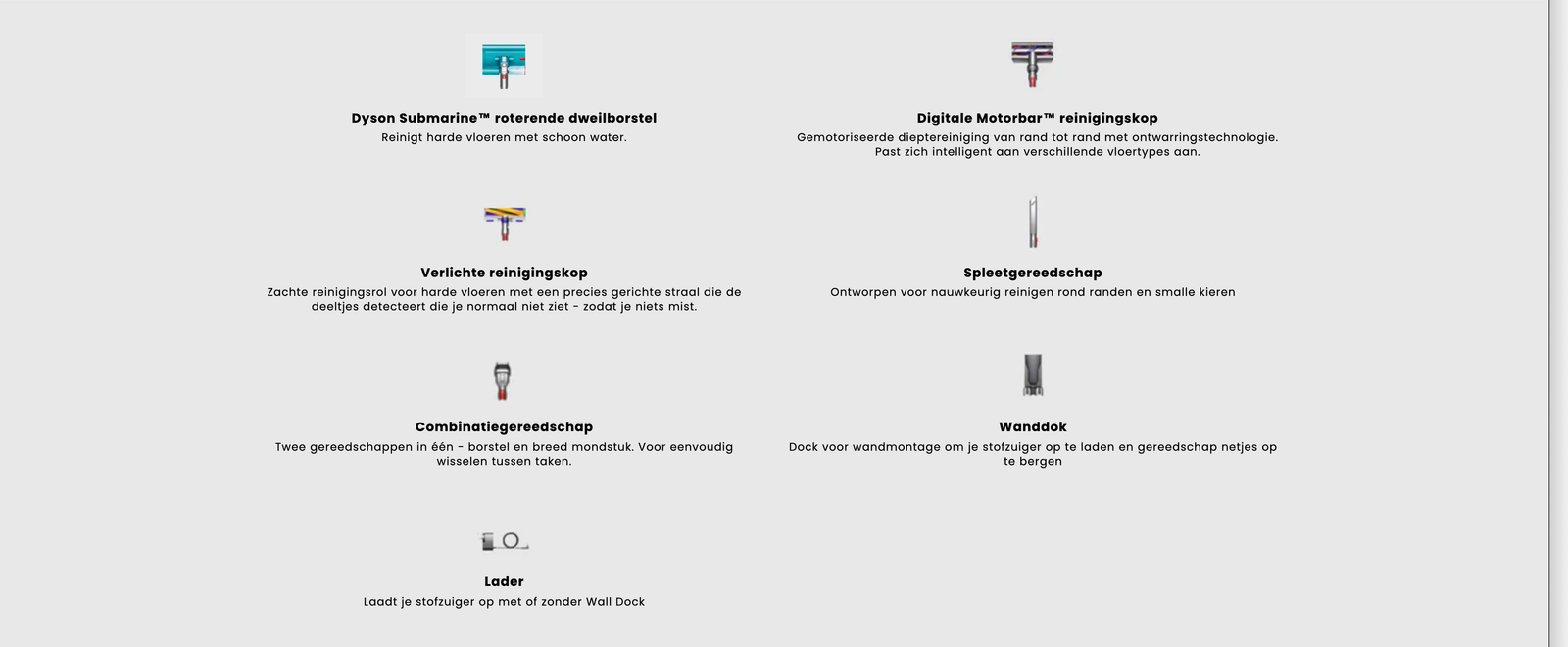 Om intelligent te kunnen schakelen tussen stofzuigen en de dweilfunctie, is de Dyson V15 Detect Submarine anders geprogrammeerd. De software op de Dyson V15 Detect heeft een andere software en is hierdoor niet compatibel met de roterende dweilborstel.