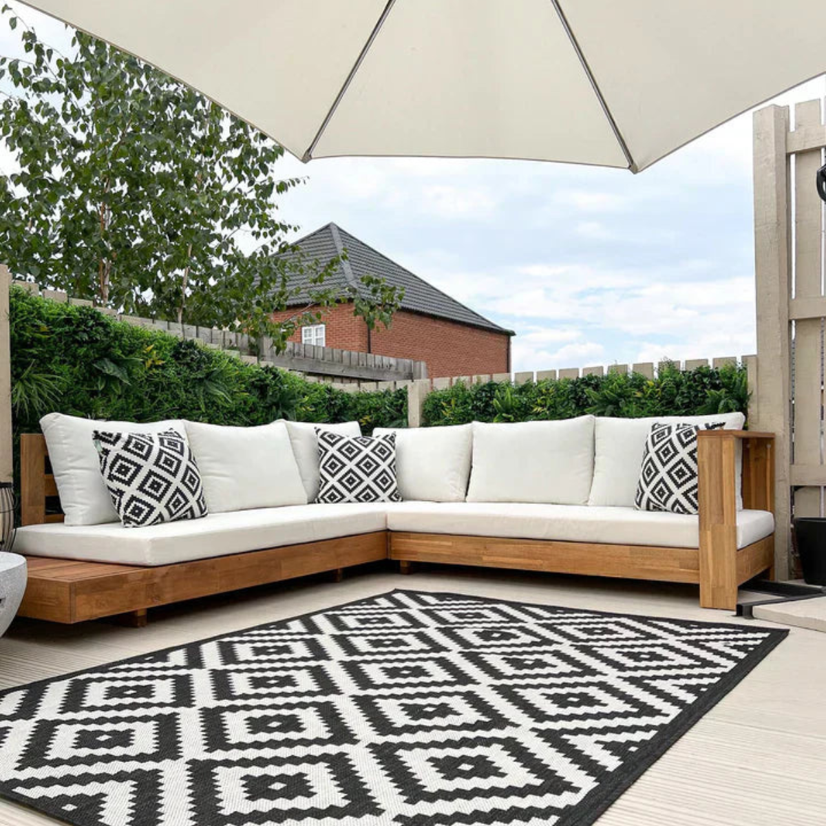 W zestawie kompletny zestaw poduszek odpornych na warunki atmosferyczne, zapewniających beztroski komfort o każdej porze roku.