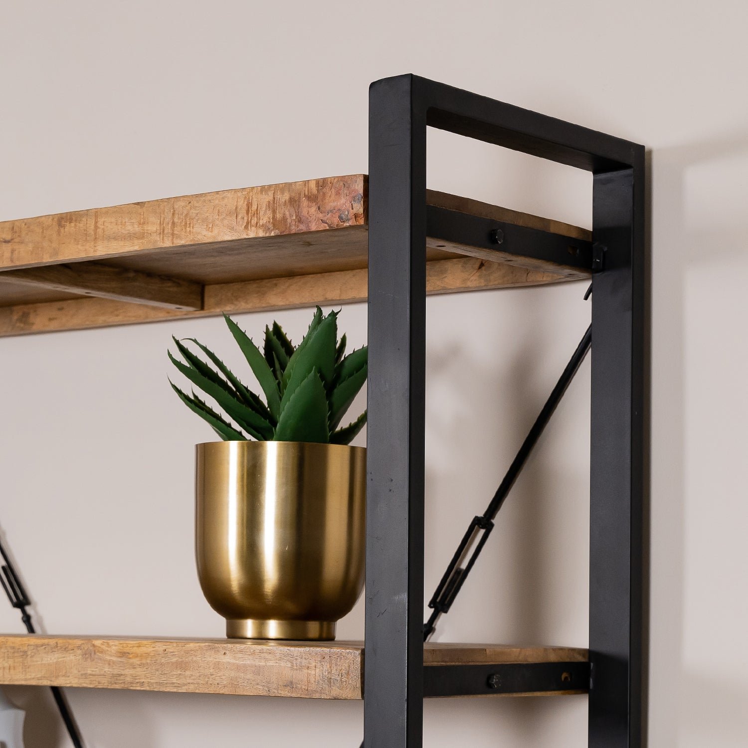 Industrialny regał na książki Britt z pięcioma półkami został wykonany z drewna mango i czarnego metalu. Dzięki pięciu szerokim półkom ten industrialny mebel oferuje mnóstwo miejsca na wyeksponowanie stylowych dekoracji oraz przechowywanie przedmiotów. Połączenie drewna mango i metalu malowanego proszkowo nadaje wnętrzu sielski, a zarazem surowy charakter. Zestaw regał Britt z innymi elementami z tej samej serii, aby stworzyć ciepłą i wyjątkową atmosferę w swoim salonie.