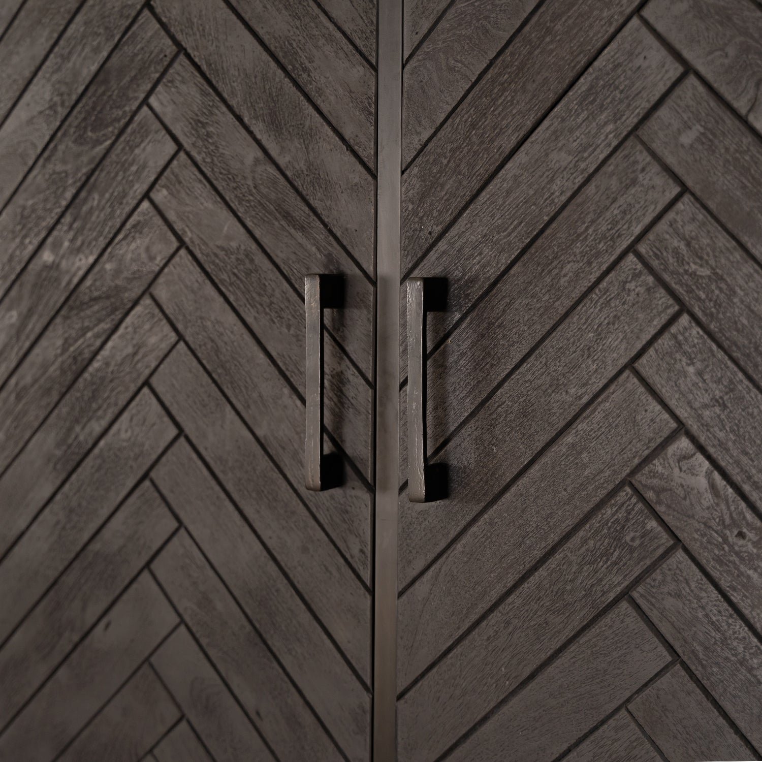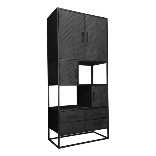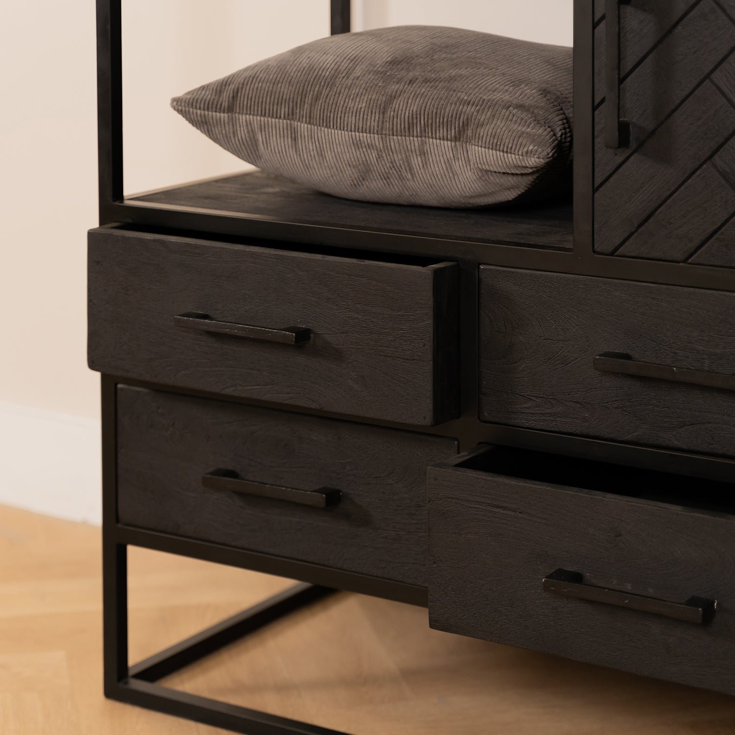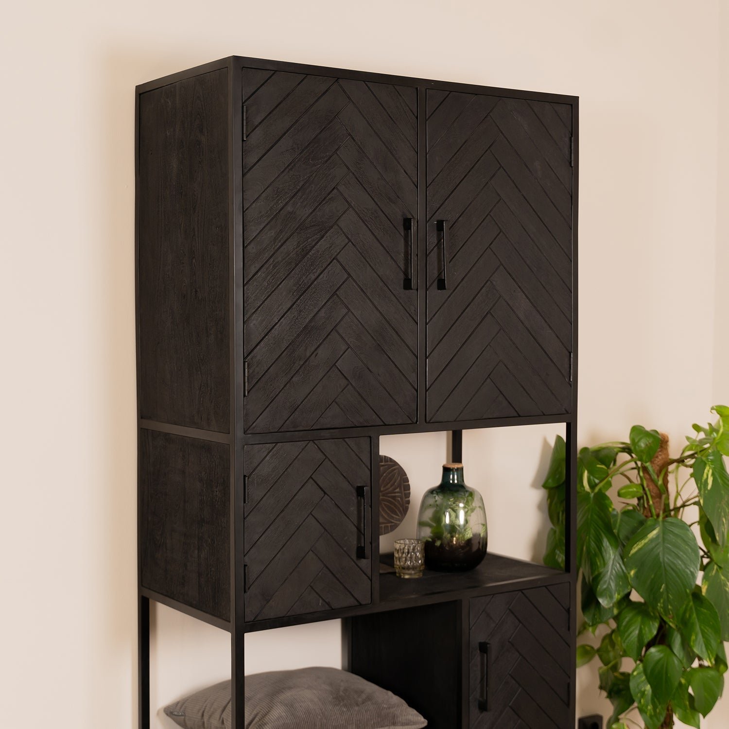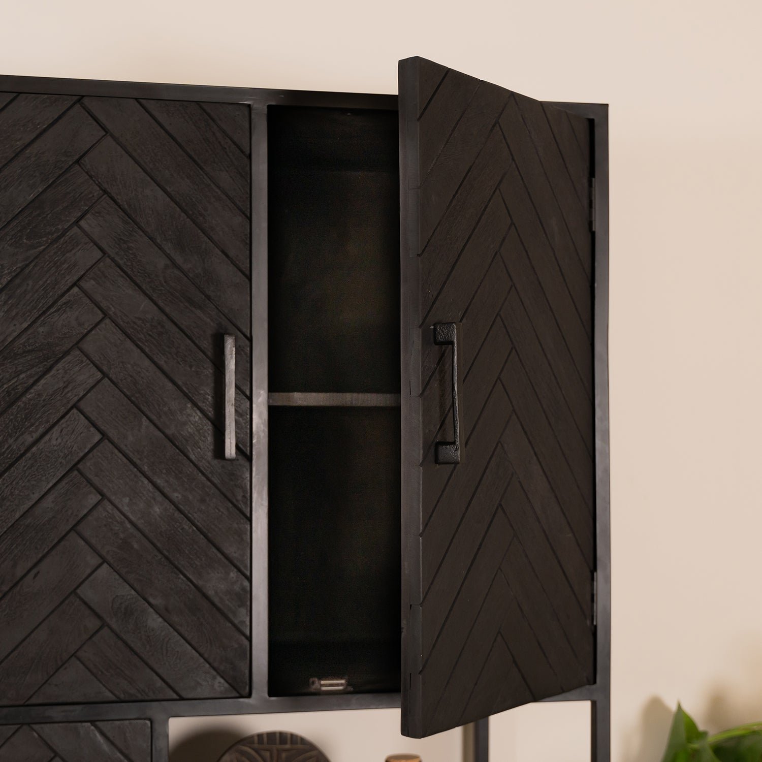 Ta czarna szafka z wzorem jodełki pochodzi z kolekcji Yara. Ten stylowy mebel cieszy oko i stanowi prawdziwy centralny punkt każdego pomieszczenia. Piękne połączenie czarnego drewna mango i stali zapewnia szykowny, industrialny wygląd. Powierzchnia drewna mango została poddana piaskowaniu i wykończona czarnym lakierem.