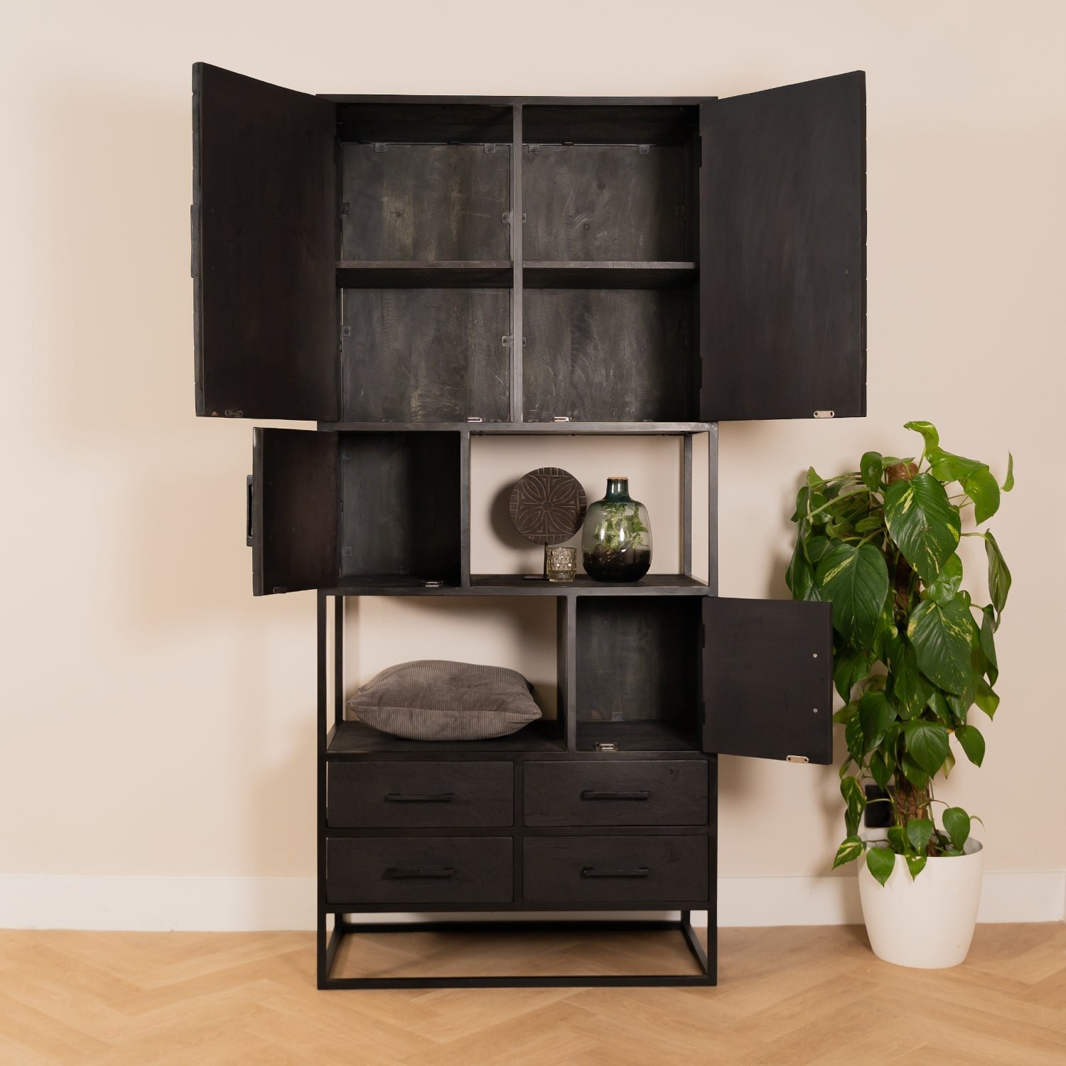 Ten efektowny czarny regał można idealnie zestawiać z innymi meblami z serii Yara oraz kolekcjami Axel, Liv czy Liv Black. Regał typu „vakkenkast” to perfekcyjne połączenie funkcjonalności i estetyki: otwarte półki pozwalają na stylową ekspozycję dekoracji, podczas gdy zamknięte części szafki pomagają utrzymać porządek przy gościach.