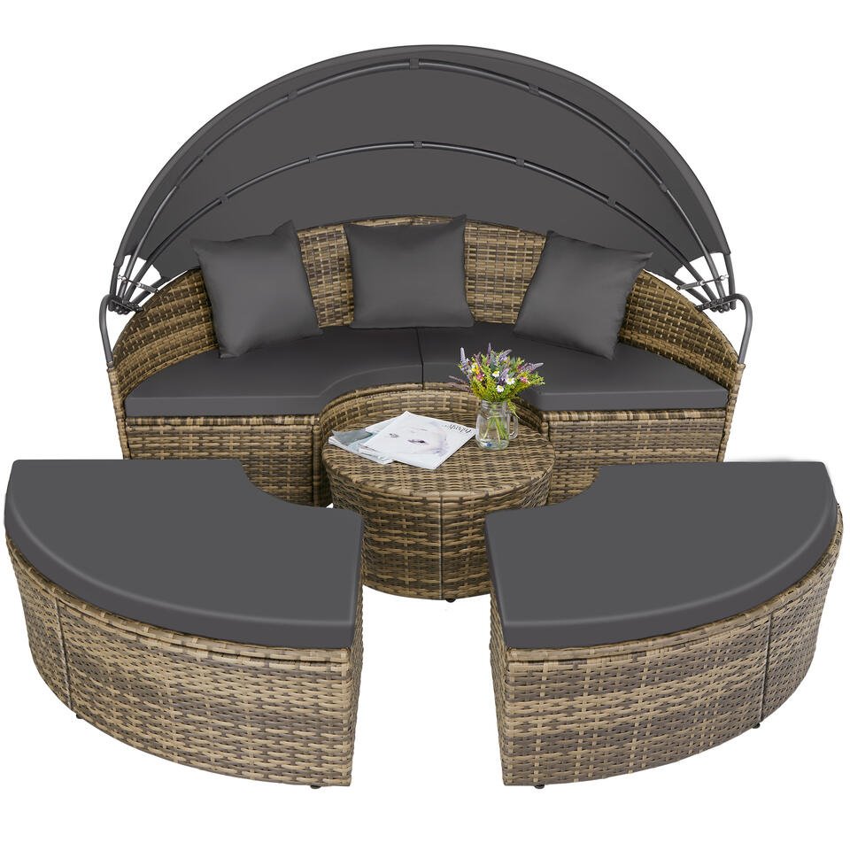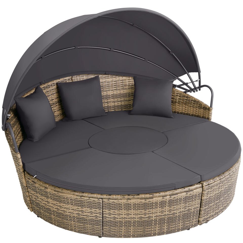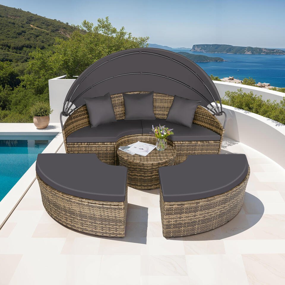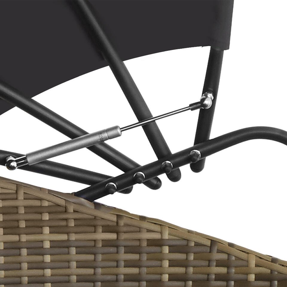 Funkcjonalna wiklinowa wyspa słoneczna charakteryzuje się atrakcyjnym wzornictwem oraz wysokim komfortem siedzenia i leżenia. Możliwe do łączenia elementy z wodoodpornymi poduszkami prezentują się, w zależności od upodobań, jako wieloczęściowy zestaw wypoczynkowy lub duże łóżko lounge. Stabilny dach przeciwsłoneczny jest mocowany na rzepy i po rozłożeniu zapewnia ochronę przed słońcem oraz wiatrem. Wysokiej jakości plecionka z wytrzymałego technorattanu oraz solidna stalowa rama sprawiają, że ta wszechstronna wyspa słoneczna stanie się Twoim ulubionym miejscem do relaksu!